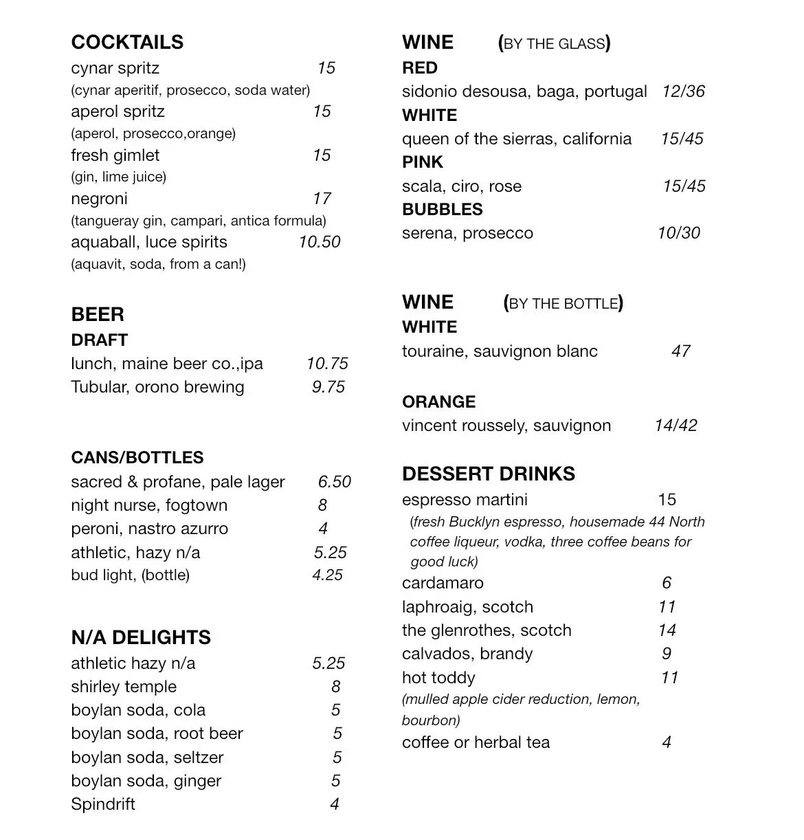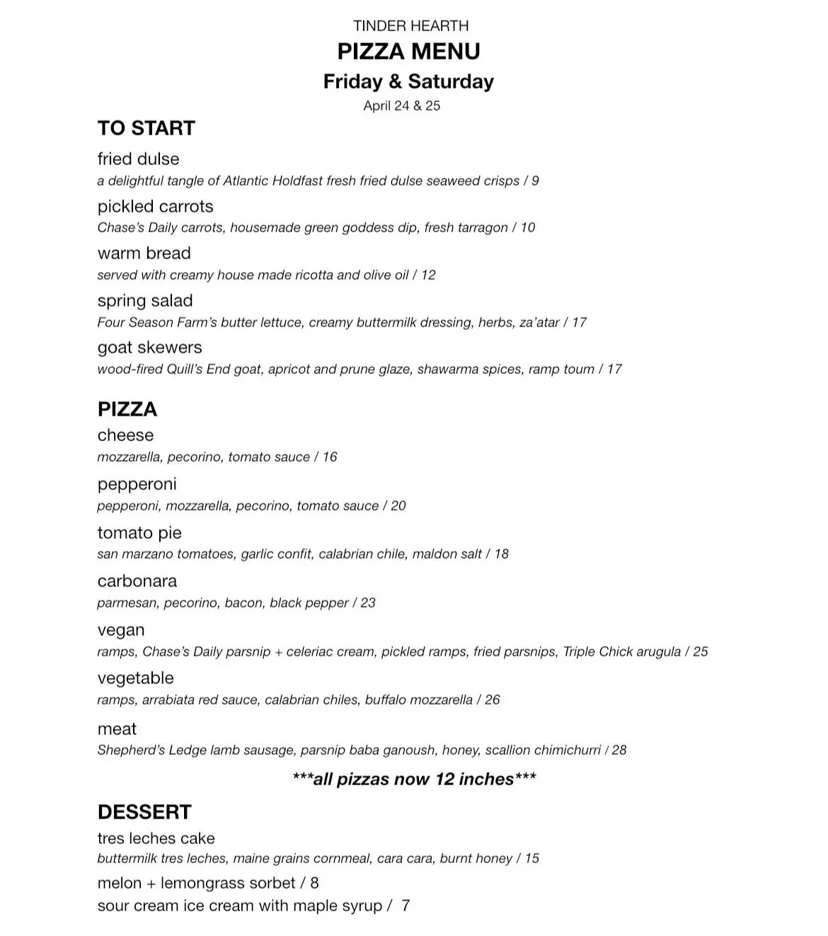 I’m feeling a bit nostalgic as the menus transition towards summer. The peepers are absolutely maddeningly loud right now, and we’ve already had some guests sitting outside to revel in it. On the menu we have the last of the citrus season, the last of the hot cider. We’re transitioning to rhubarb, and we have ramps for a short period, and the first nasturtium leaves are in from Little Red Flower Truck.