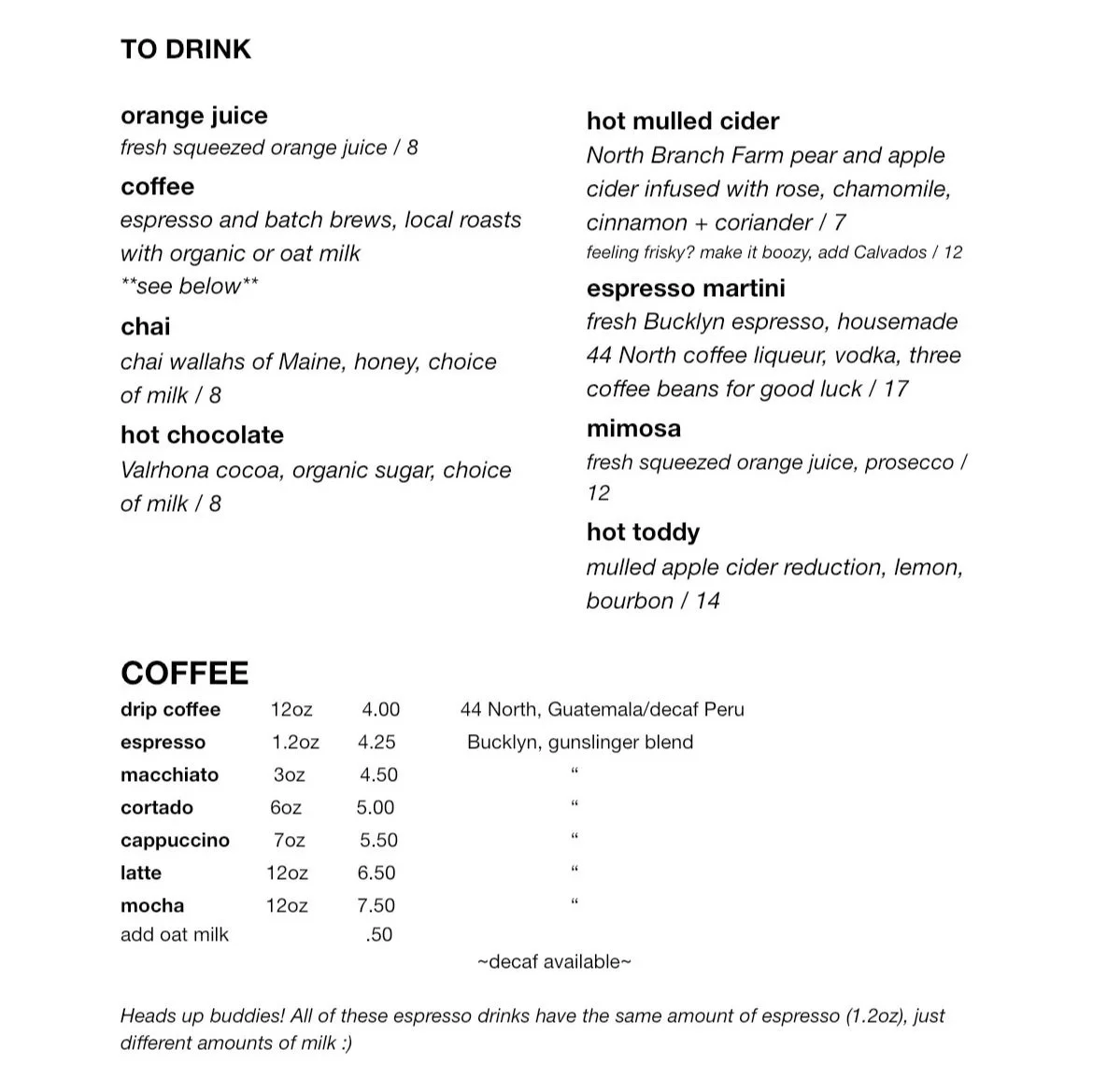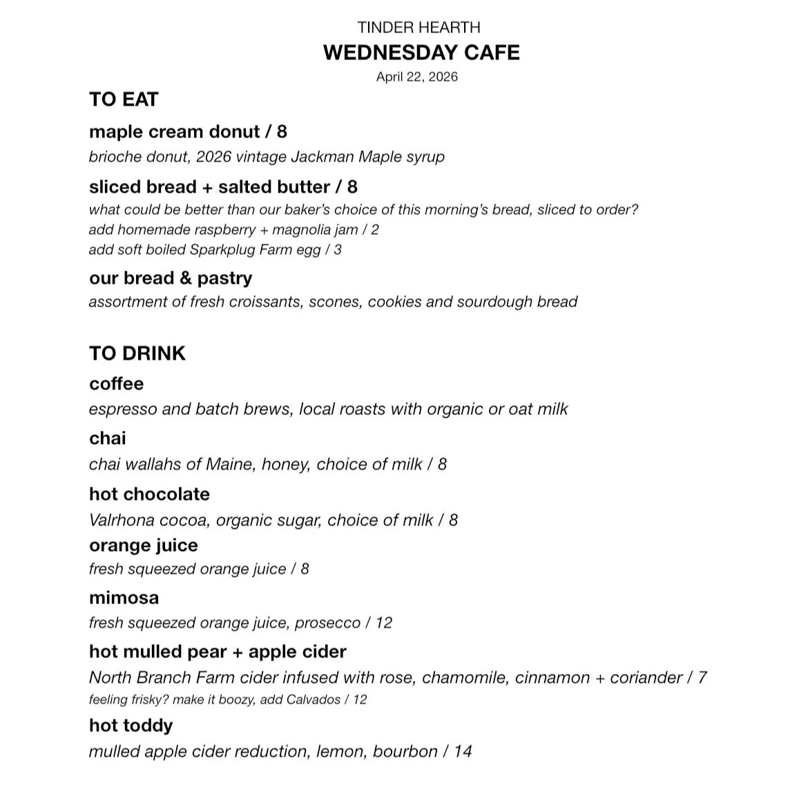 For brunch! The blueberry pop tart was really sweet last week, so that's on again. The maple porridge is so comforting with the pecan crunch, with the last of the summer's peaches from the Trowbridges next door. Tim was hankering for a pancake option, and so I pulled the crepe recipe from Café Mutton from my time in the Hudson Valley, but I of course couldn't help playing with it so I ended up making it about 75% whole spelt and some of the Maine Grains whole wheat pastry flour, and then I added the whey from the homemade ricotta— it's really yummy so I'm going to keep the toppings super simple with a rhubarb glaze and butter. And we have some really nice, light springy savory brunch options— the omelette with the smoked haddock brandande; the latkes are back!—they’re potato and celiac, with with lox. And lastly a Rainbow Farm roast chicken matzo ball soup. <3