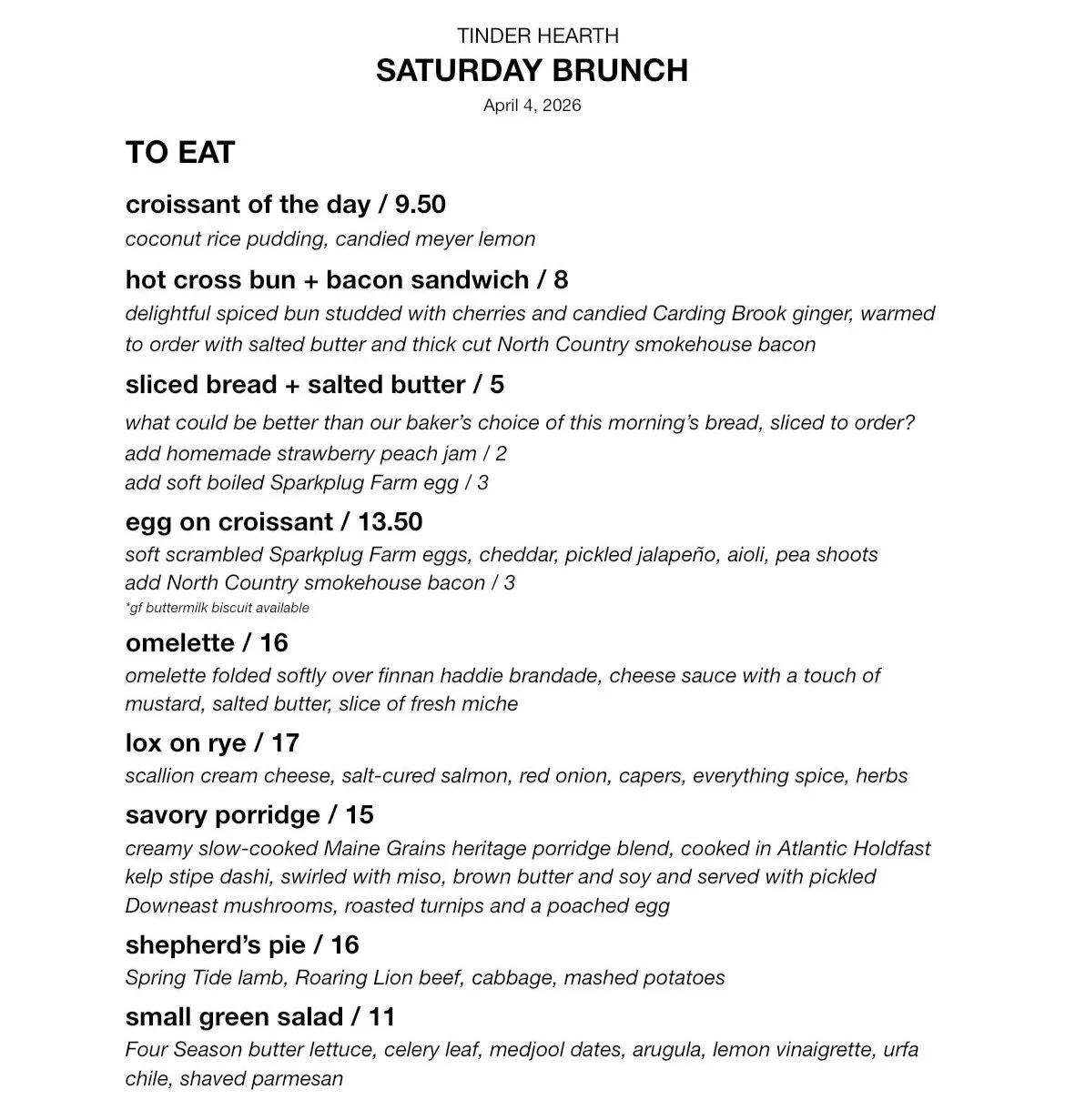 BRUNCH MENU HIGHLIGHTS from Elisabeth: Emily is making a coconut rice pudding and candied Meyer lemon croissant of the day. The omelette is a finnan haddie brandade which is inspired by an omelette that they did at Café Mutton when I was cooking there, with a cheese sauce and touch of mustard.
