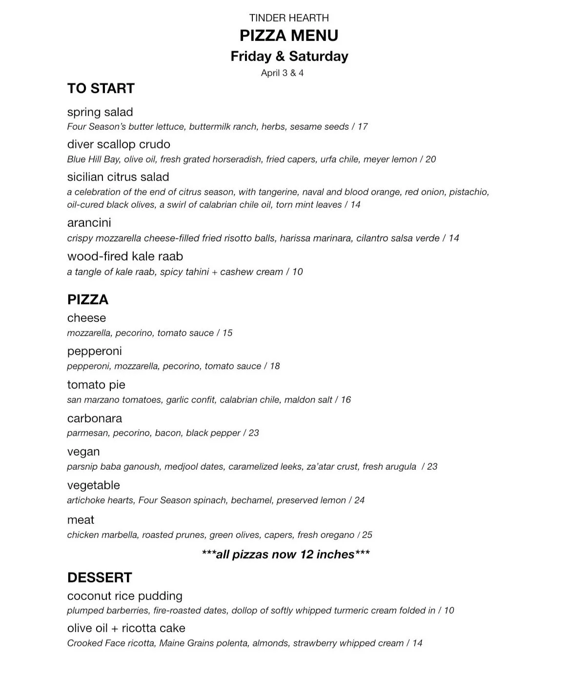 For pizzas we’re bringing back chicken marbella—it feels like the right time of year for prunes, so I'm excited about that. The veggies is a beautiful classic with artichoke hearts and spring spinach, béchamel, and some preserved lemons that Yussuf made. The vegan will be fun— it’s a smoky parsnip baba ghanoush have za’atar, caramelized dates and some beautiful fresh arugula from Four Season Farm.