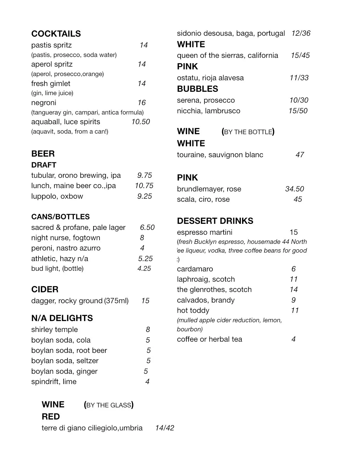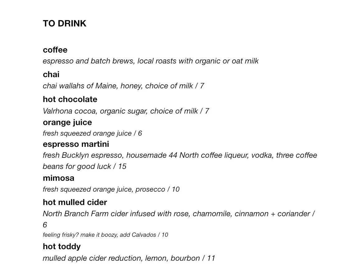 WE ARE BACK!! It’s been a busy six weeks of projects and winter-scale bread and pastry production for those of us who stuck around. The rest of our team went out into the world, pursuing different projects. Chef Elisabeth is carrying a ton of inspiration back from her time away from Brooksville. She says: “it’s been such a pleasure to come back to menu writing and being able to incorporate all these really lovely things I learned from various chefs along the way, either when eating out at fabulous restaurants or when I staged at the three restaurants in the Hudson Valley.” Check out these menus, see Elisabeth’s notes on them below, and we hope to see you in the barn soon!